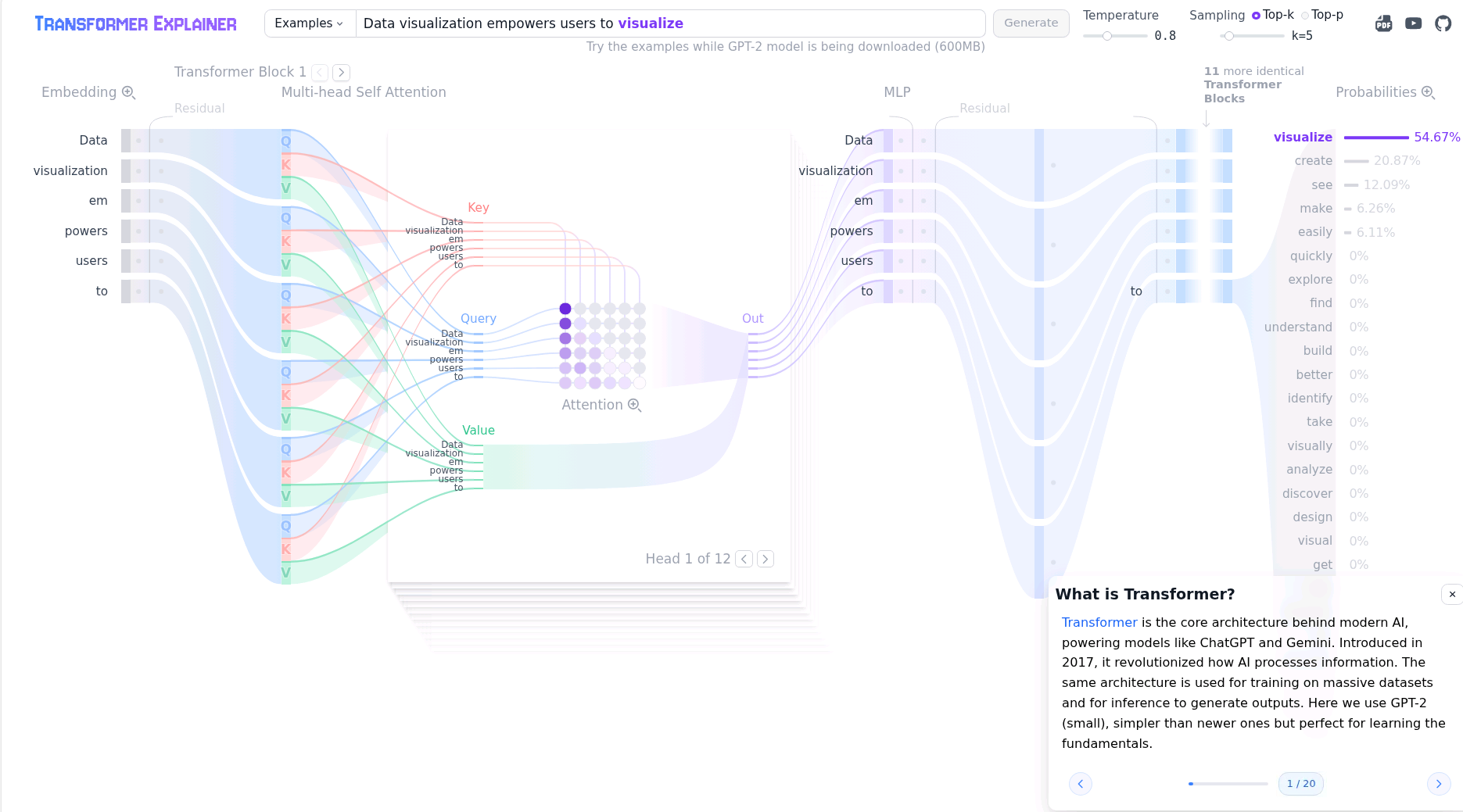 I recently was researching about how LLMs function and came across two very fun and interactive explanations that are screenshotted below. It further confirm in my head that everything is math. The generation of knowledge and words can be transformed into weighted matrixes with statistical outputs.